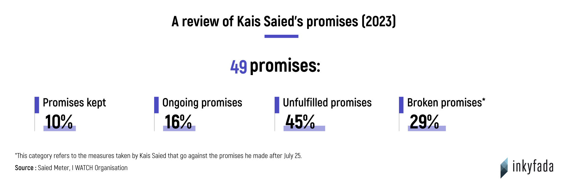 The I Watch report stated that promises such as making a new history for Tunisia based on a real democracy, recovering 13 500 billion dinars by the end of June 2023, and respecting human rights, have not been respected or kept.