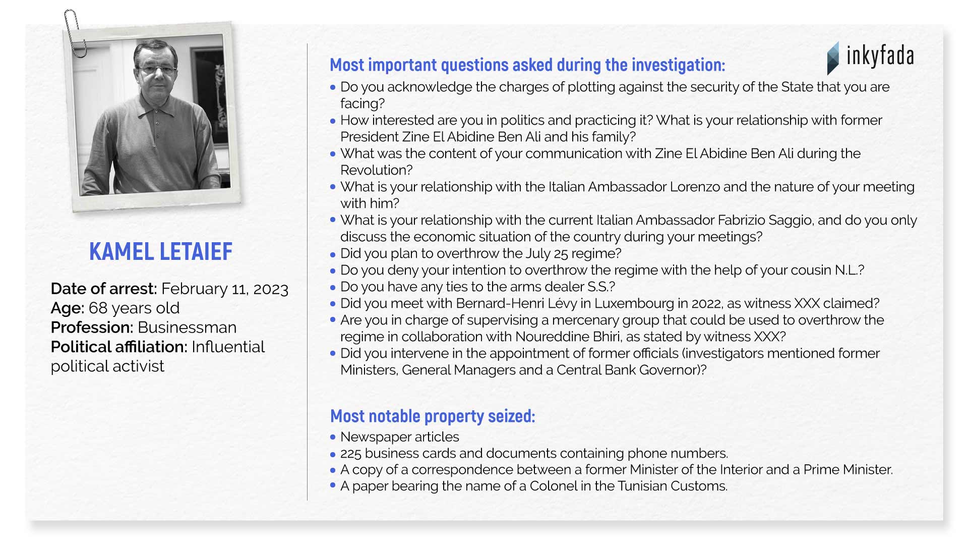 Only three out of the dozen detainees were released: Chaima Issa, Lazher Akremi, and Noureddine Boutar, with the latter being required to pay a one-million-dinar bond. The following infographics showcase five of the defendants, along with the facts and evidence used to charge them.
