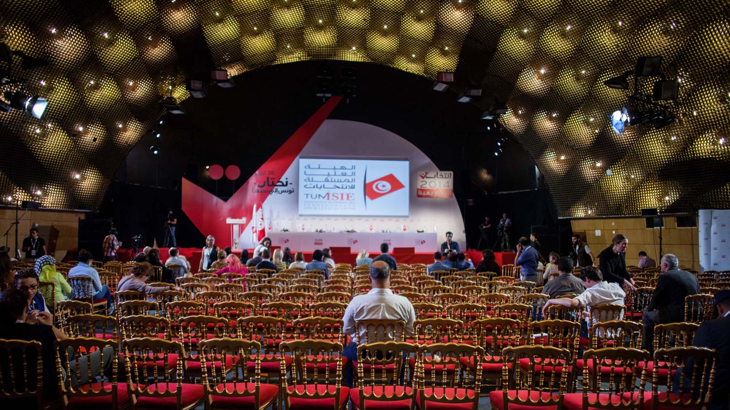L’Instance Supérieure Indépendante des Elections a tenu de nombreuses conférences de presse toute la journée. Ici des journalistes attendent. Crédit : Kais Zriba