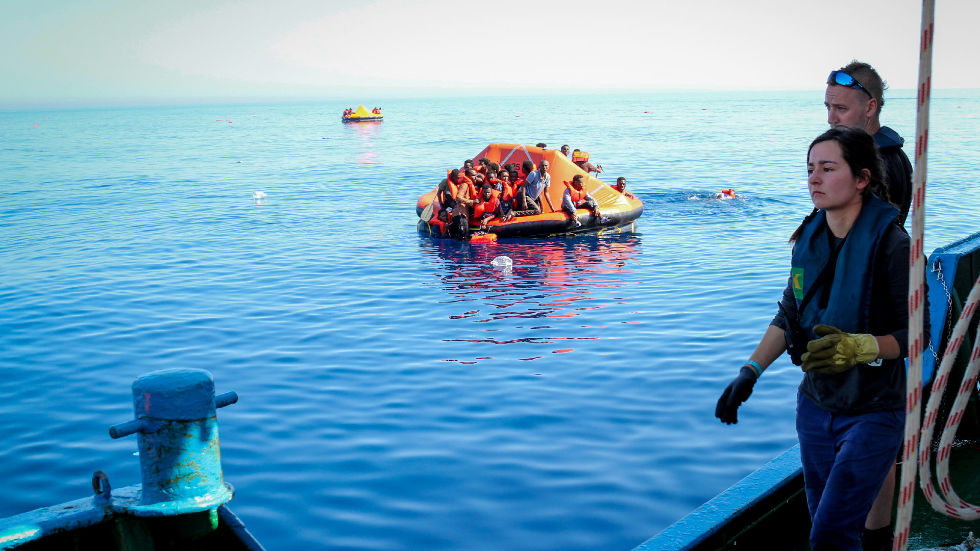 Jumelles toujours pointées à l’horizon, les équipages des ONG scrutent en direction des coordonnées données par le MRCC pour apercevoir les bateaux. Une fois repérés, ils envoient un RIB (bateau rigide gonflable) où un interprète distribue les gilets de sauvetage tout en calmant et en expliquant aux gens comment ils vont être transférés à bord. “ Parfois c’est très compliqué puisque certains ne comprennent pas la langue”, explique Maggy, l’interprète du Iuventa.