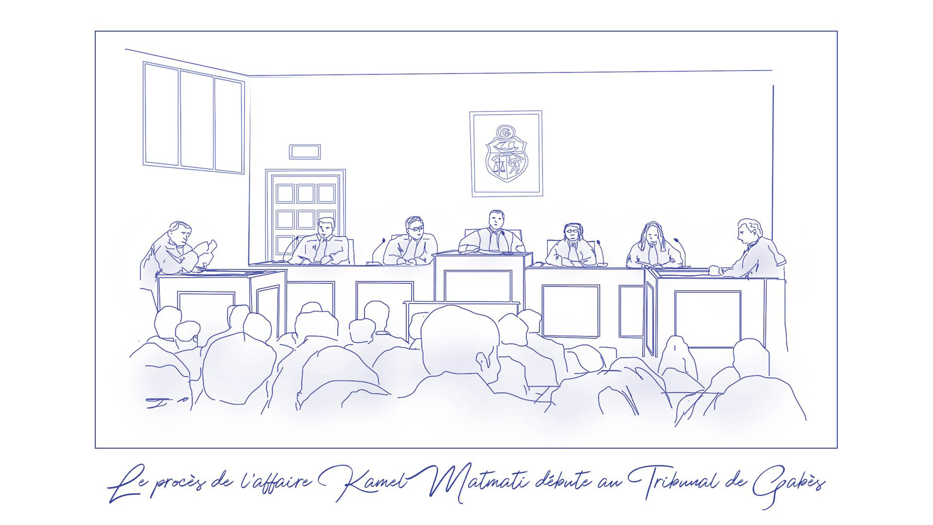 “Homicide volontaire précédé de crime de torture et suivi des crimes de dissimulation de preuves et dissimulation de cadavre”, “Torture ayant entraîné la mort”, “Disparition et détention forcée”... À l’ouverture du procès de Kamel Matmati, dans une salle d’audience surpeuplée, le juge lit l’acte d’accusation de l’Instance Vérité et Dignité. Une douzaine d’accusés, directs ou indirects, sont nommés un par un. Aucun ne se manifestera.