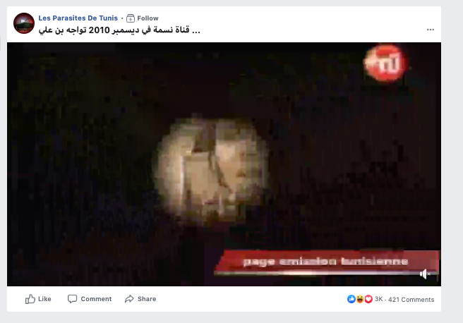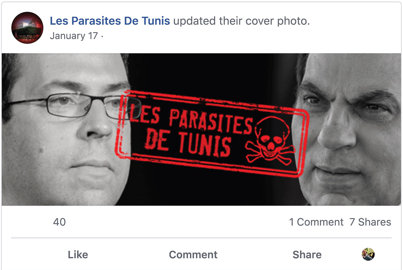 Le 17 janvier 2019, une page nommée “Les parasites de Tunis” est créée sur Facebook. Elle est gérée par cinq administrateurs·trices localisé·es en Tunisie. En photo de couverture, l’actuel chef du Gouvernement, Youssef Chahed, et l’ancien dictateur, Zine El Abidine Ben Ali, sont estampillés “Les Parasites de Tunis”, avec le dessin d’une tête de mort. Le ton est donné.