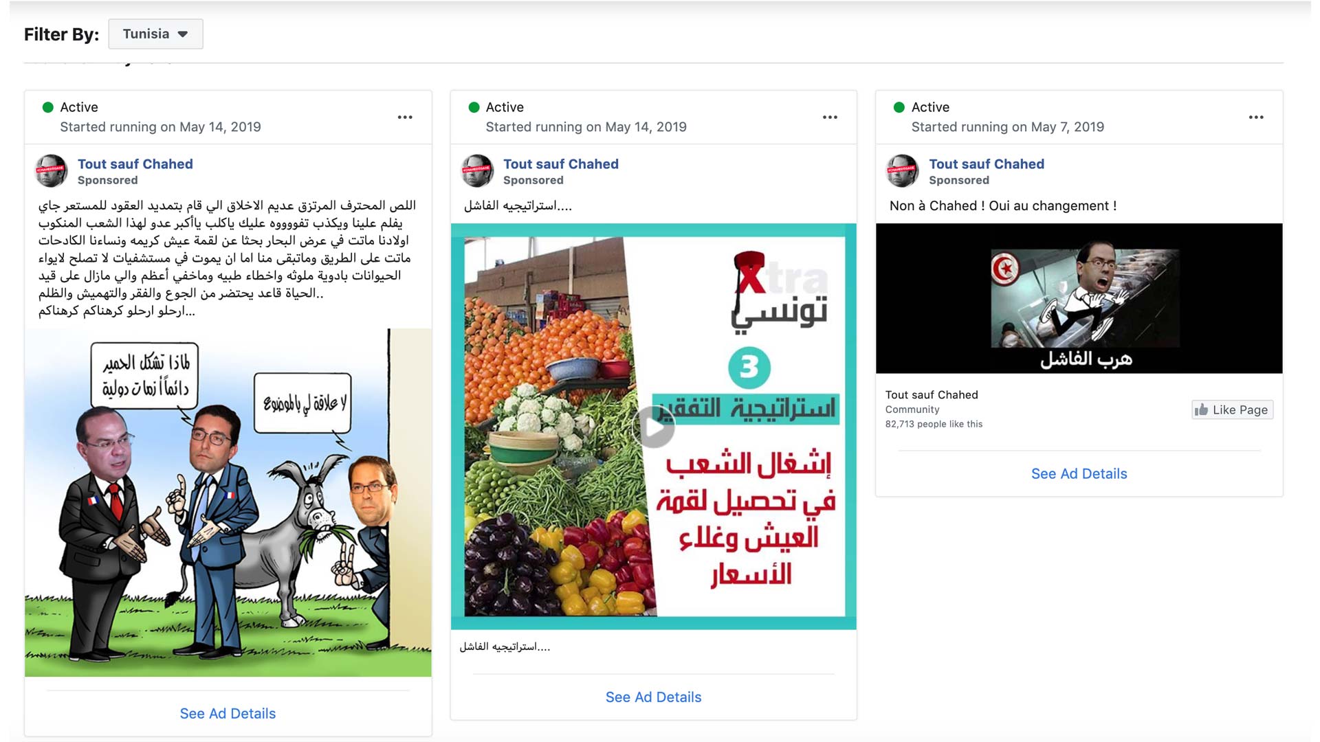 Les taux d’engagement ou d'interaction générés, supérieurs à la moyenne, supposent que le contenu partagé a été largement sponsorisé, ce que l’équipe d’ Inkyfada a pu constater pour au moins deux de ces pages au cours des dernières semaines. Le jour de sa désactivation, la page “Tout sauf Chahed” affichait encore trois campagnes publicitaires actives simultanément.