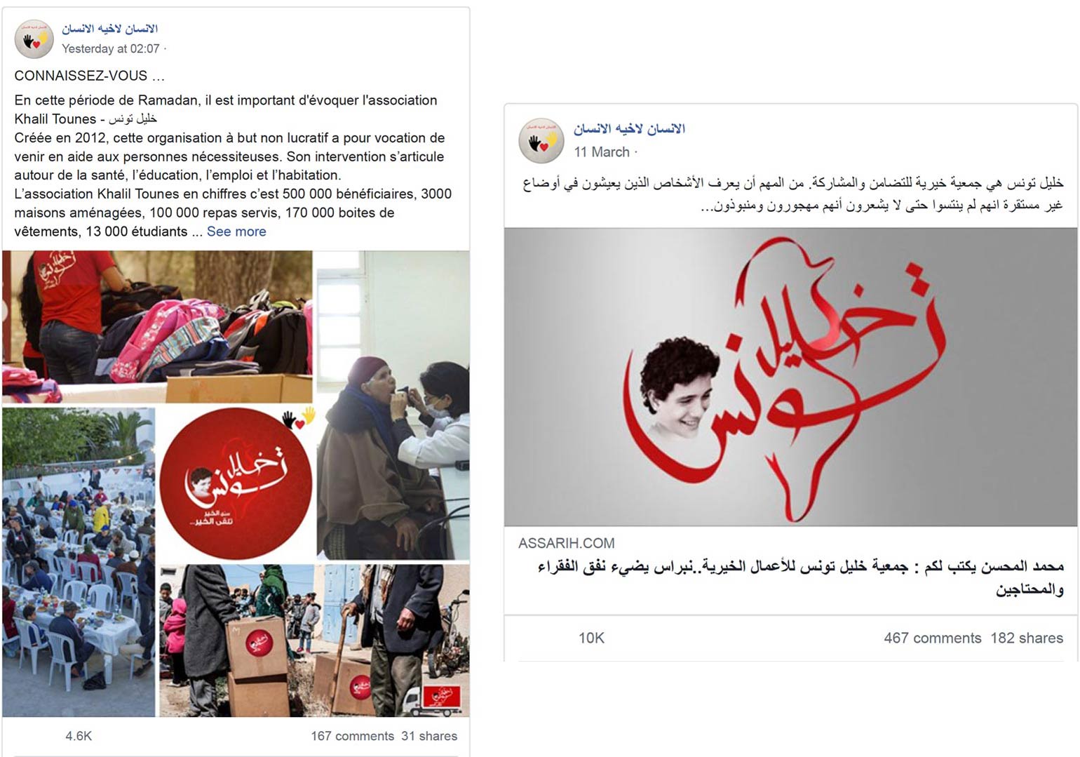 Pour améliorer la situation, une des pages fait la promotion d'actions caritatives ou humanitaires. Parmi plus d'une vingtaine d'initiatives mises en avant, Khalil Tounes, l'association de Nabil Karoui, est la seule à être présentée deux fois et bénéficie du plus grand nombre d'interactions comparée aux autres publications de la page (plus de 40% de l'ensemble des interactions générées).