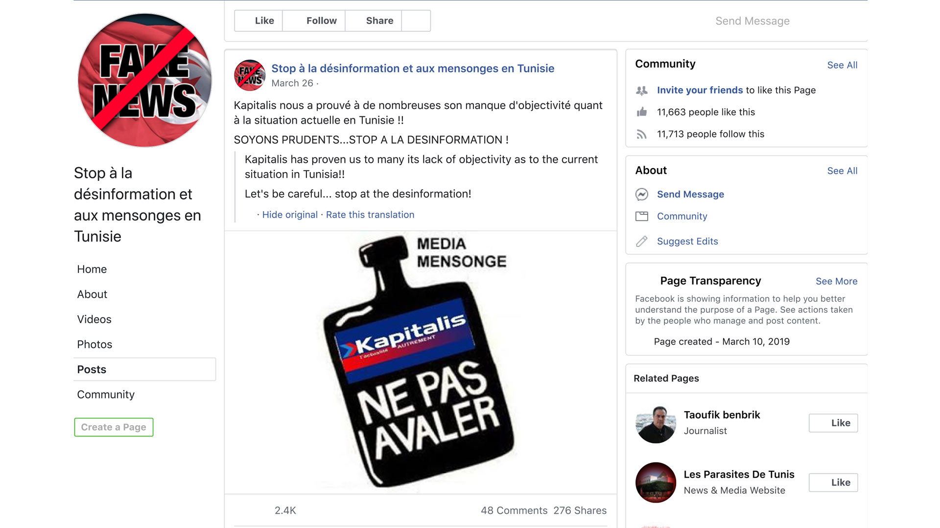 La page "Stop à la désinformation et aux mensonges en Tunisie" s'en prend particulièrement au site d'informations en ligne Kapitalis.com et à son propriétaire Ridha Kéfi. Ce dernier ne cache pas une animosité particulière à l'encontre de... Nabil Karoui.