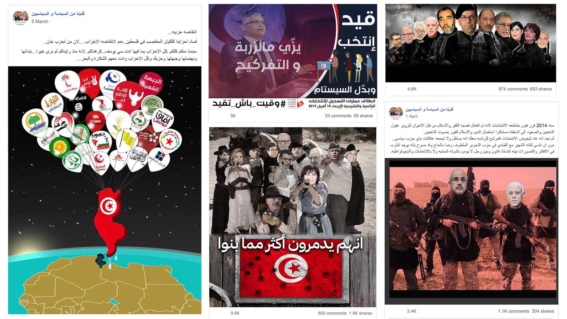 Différentes captures d'écran de la page "Marre de la politique et des politiciens" qui publie des photomontages hostiles aux principales personnalités politiques tunisiennes. La publication de gauche s'attaque aux partis politiques dans leur ensemble. Au milieu (en haut), un exemple d'illustration appelant à s'inscrire puis à voter aux prochaines élections pour "changer le système". En bas à droite, Kais Saïed, un des candidats favoris selon les sondages d'opinion, est accusé d'être proche du leader de Hizb Ettahrir, un parti islamiste radical.