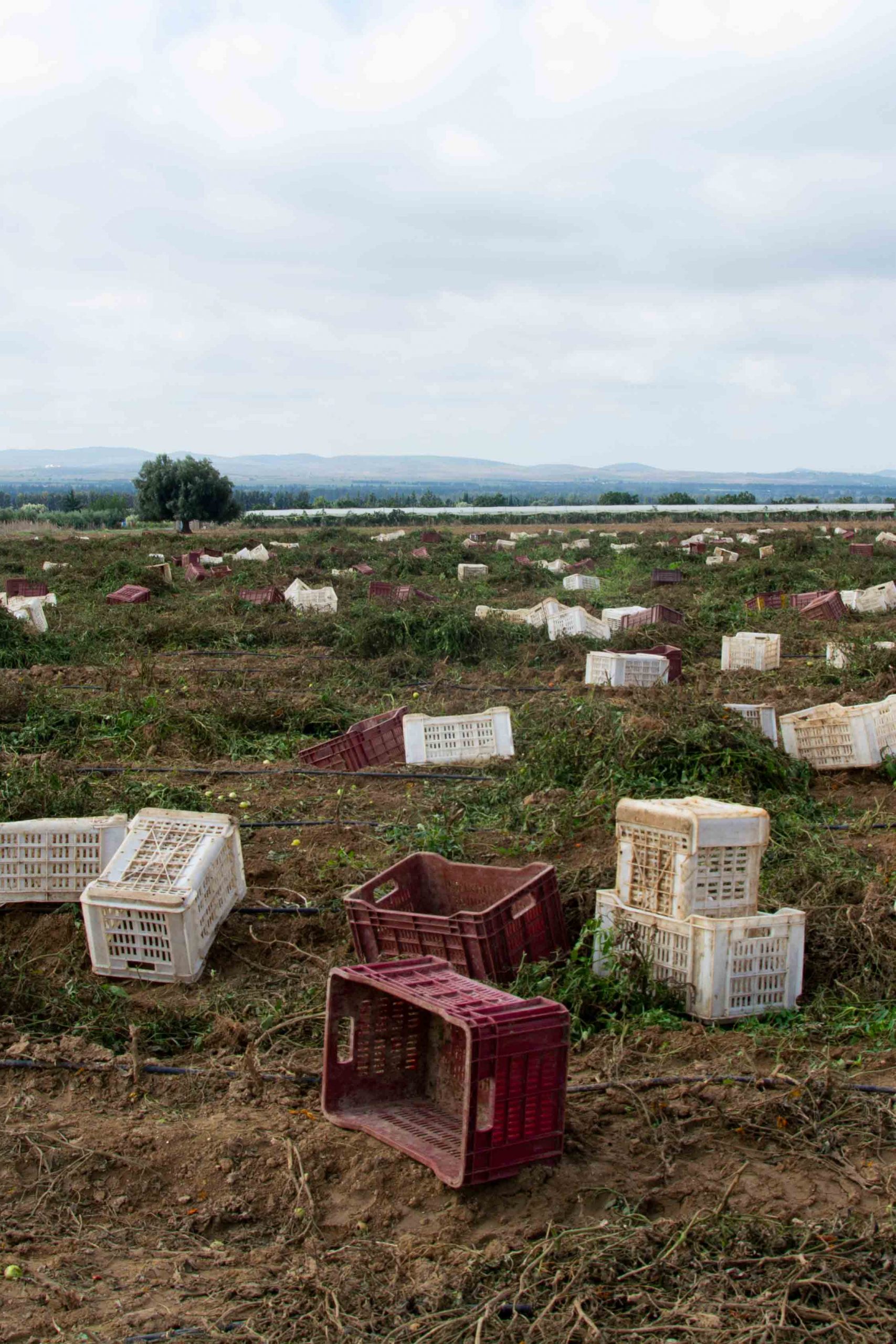 Dans un champ de tomates proche de celui de Chokri, les tomates ont mieux résisté au climat. Les cageots restent sur le champ, après que les ouvrières agricoles ont ramassé les cultures.