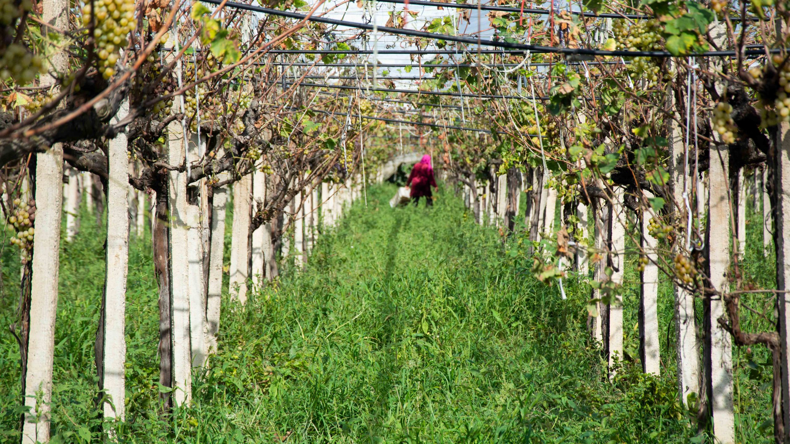 Une ouvrière agricole récupère du raisin des vignes que possède Ahmed.