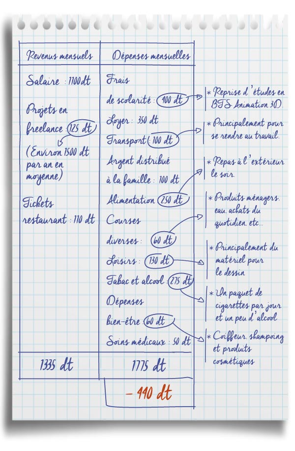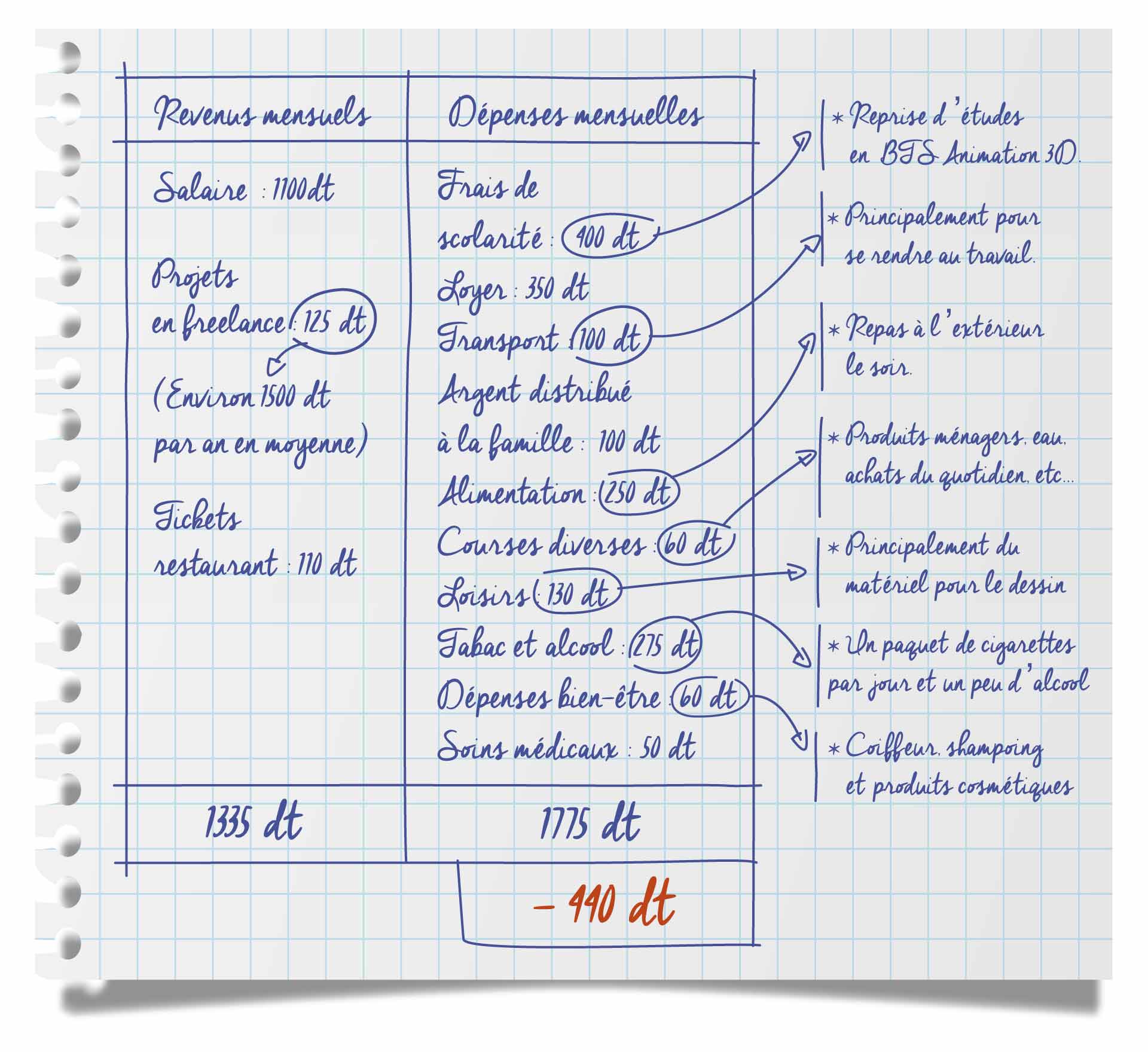 “Je n'ai jamais assez d'argent pour finir le mois”, déplore Neïla. La plupart du temps, ses comptes sont dans le rouge. Avant de reprendre ses études, elle rencontrait déjà des difficultés et son admission en BTS Animation 3D ne va pas arranger les choses, au point qu'elle risque de se retrouver avec près de 500 dinars de découvert tous les mois.