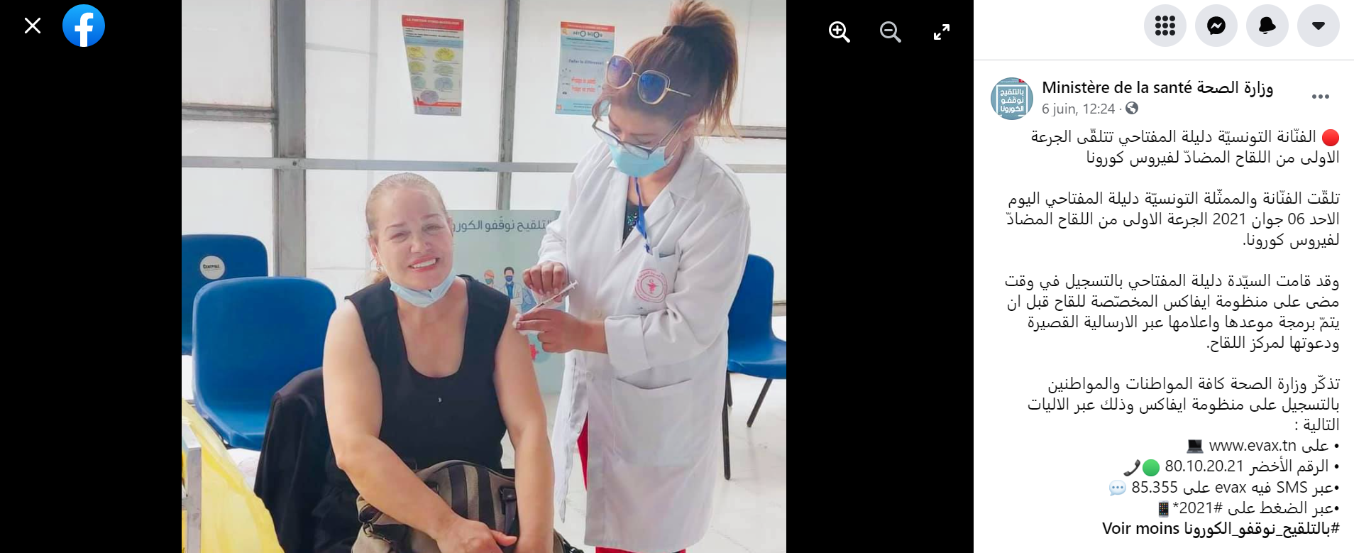 Le 6 juin, le ministère de la Santé publie sur sa page Facebook une photo de l’actrice tunisienne Dalila Meftahi, 61 ans.
