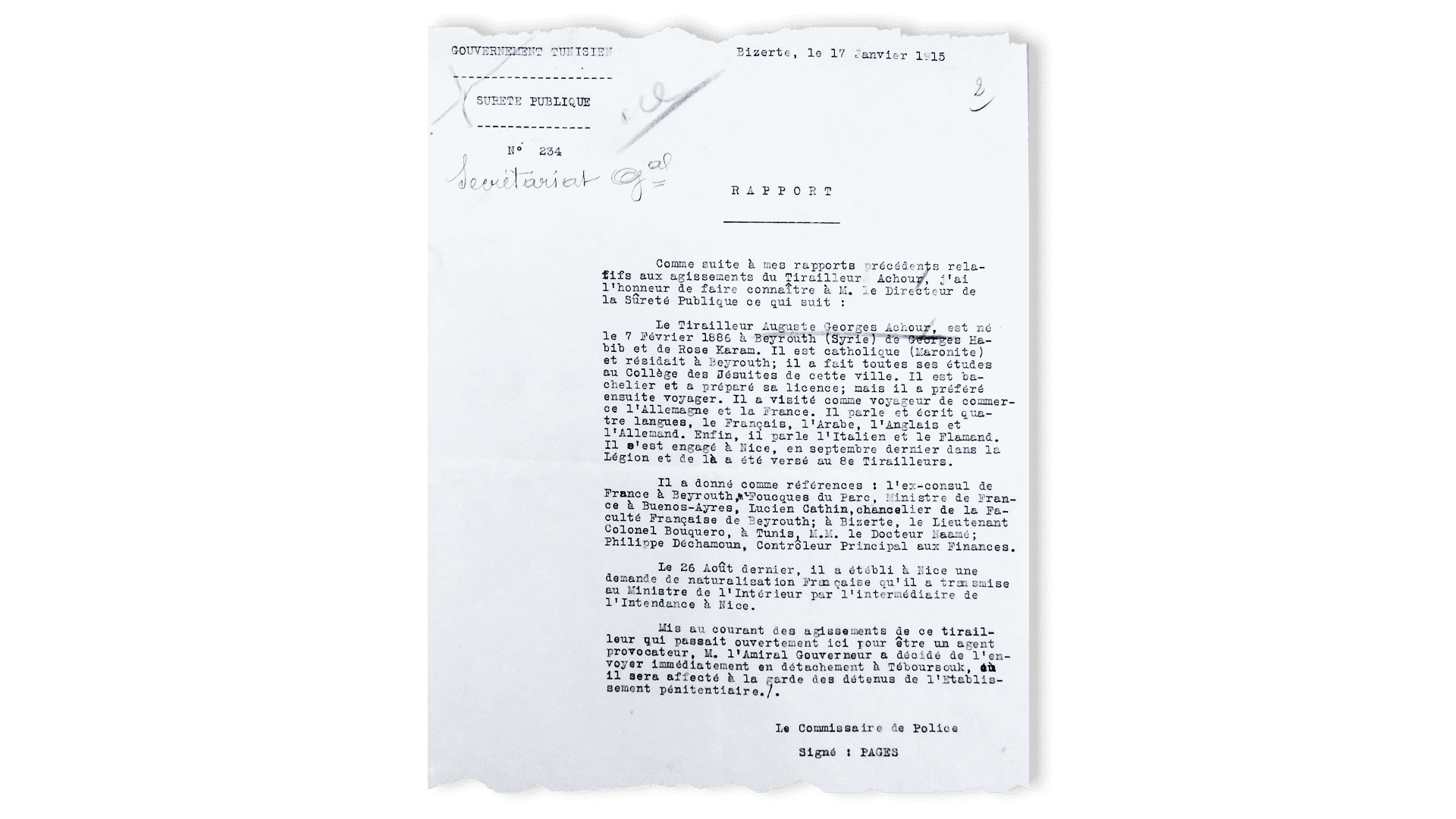 Depuis Téboursouk, la police juge son cas sévèrement. Paternaliste, elle sous-entend qu’il ne mérite pas la nationalité française. Le commissaire de la ville se désole ainsi dans une note datant du 16 mars 1915 : “Ce Libanais affectait un grand dévouement à la France et un profond désir d’obtenir la naturalisation française, en sa qualité de catholique d’Orient. Intelligent, instruit [...], il était classé au peloton des élèves-caporaux [...]”.