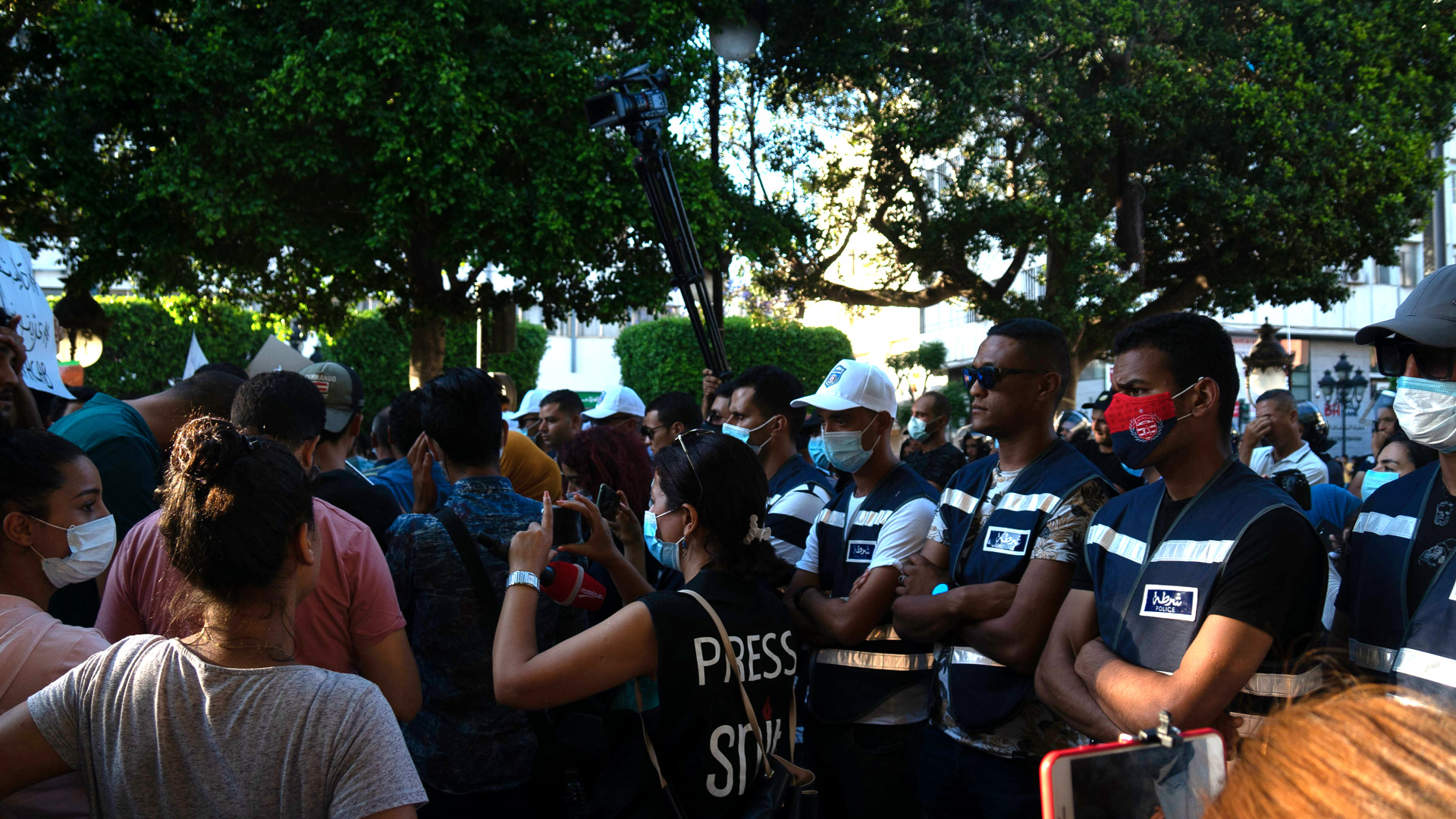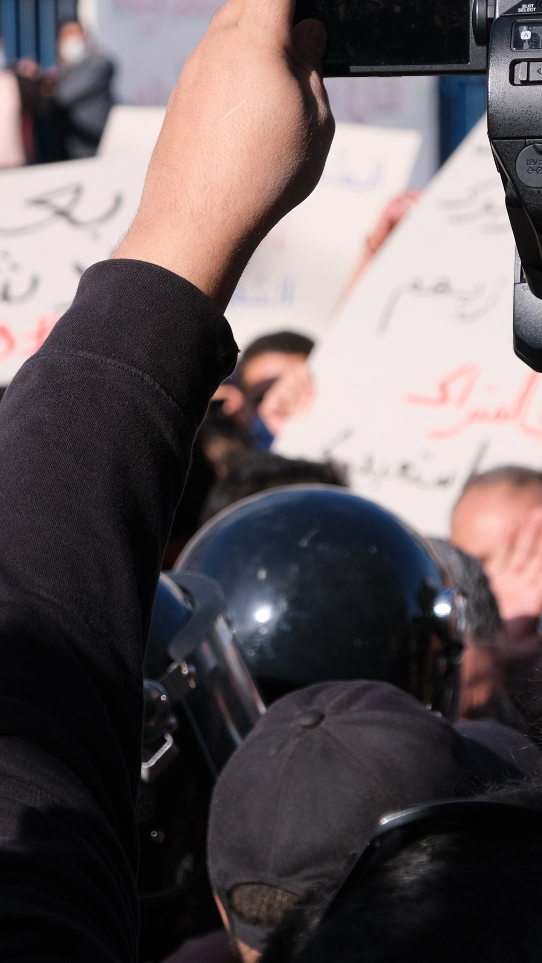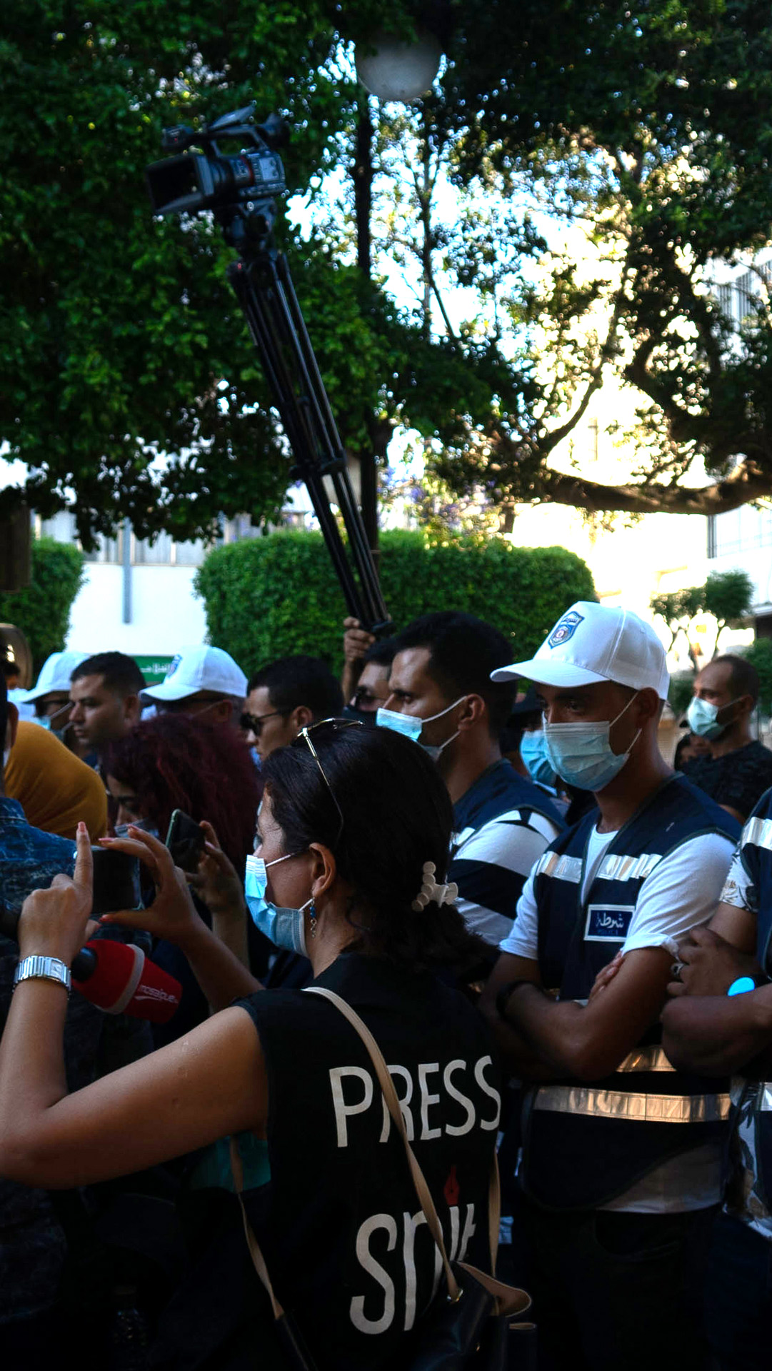 Pour Khaoula Chabah, membre du centre de sécurité du Syndicat national des journalistes tunisiens (SNJT), les violences policières envers les journalistes pendant les manifestations ont toujours été présentes. Pour y remédier, elle explique que depuis 2017, le syndicat collabore avec le Ministère de l’Intérieur afin de venir en aide aux journalistes violenté·es pendant les protestations. “Le porte-parole du ministère réglait 90% des cas de journalistes violentés ou intimidés qui venaient à nous”, raconte cette dernière.