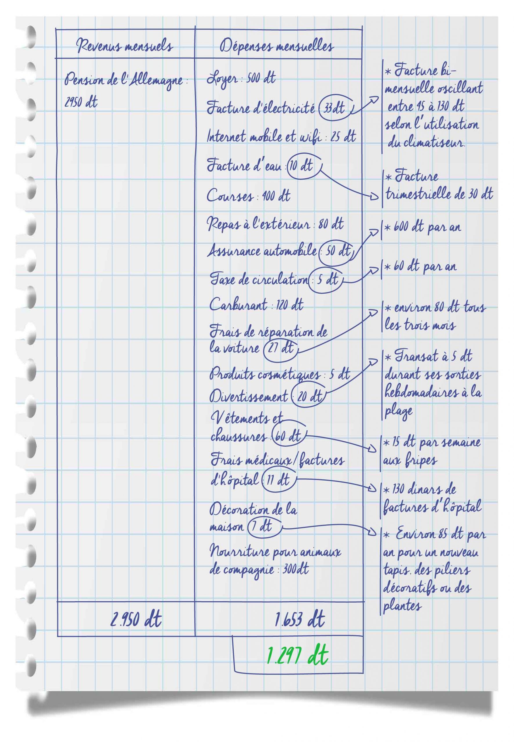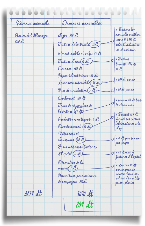 Chaque mois, Marlies économise environ 1 000 dinars pour faire face à des dépenses imprévues, comme une visite chez le médecin ou à l'hôpital ou une réparation de voiture. Elle a une assurance maladie en Allemagne qui est directement déduite de sa pension. Marlies ne sait pas combien elle paie pour cette assurance, mais elle peut obtenir un remboursement allant jusqu'à 200 dinars par an pour les frais médicaux en Tunisie. Ses frais médicaux varient en fonction de sa maladie ou du traitement médical nécessaire. L'année dernière, Marlies a dépensé environ 260 dinars en traitements médicaux, Elle en a récupéré 130 dinars, remboursés par son assurance maladie.