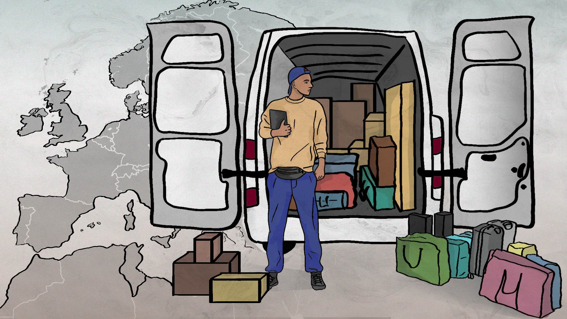 Aymen est l'un des nombreux transporteurs privés qui utilisent leurs camionnettes pour faire transiter des marchandises entre l'Europe et la Tunisie. Lui et ses collègues assurent la liaison entre les Tunisien·nes vivant à l'intérieur du pays et leurs proches à l'étranger. Ils aident les parents à envoyer de la nourriture tunisienne à leurs enfants étudiant à l'étranger, ainsi que les Tunisien·nes voulant acheter des produits introuvables ou trop chers en Tunisie.