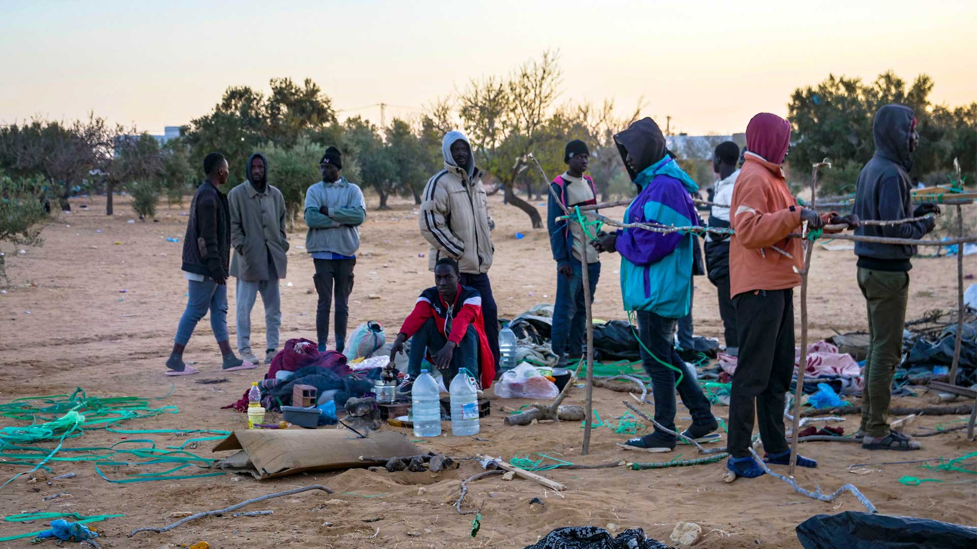 Dans l’oliveraie d’El-Amra, un groupe de migrants s’efforcent de reconstruire leur cabane, détruite lors d’un assaut de la Garde nationale du 26 novembre 2023