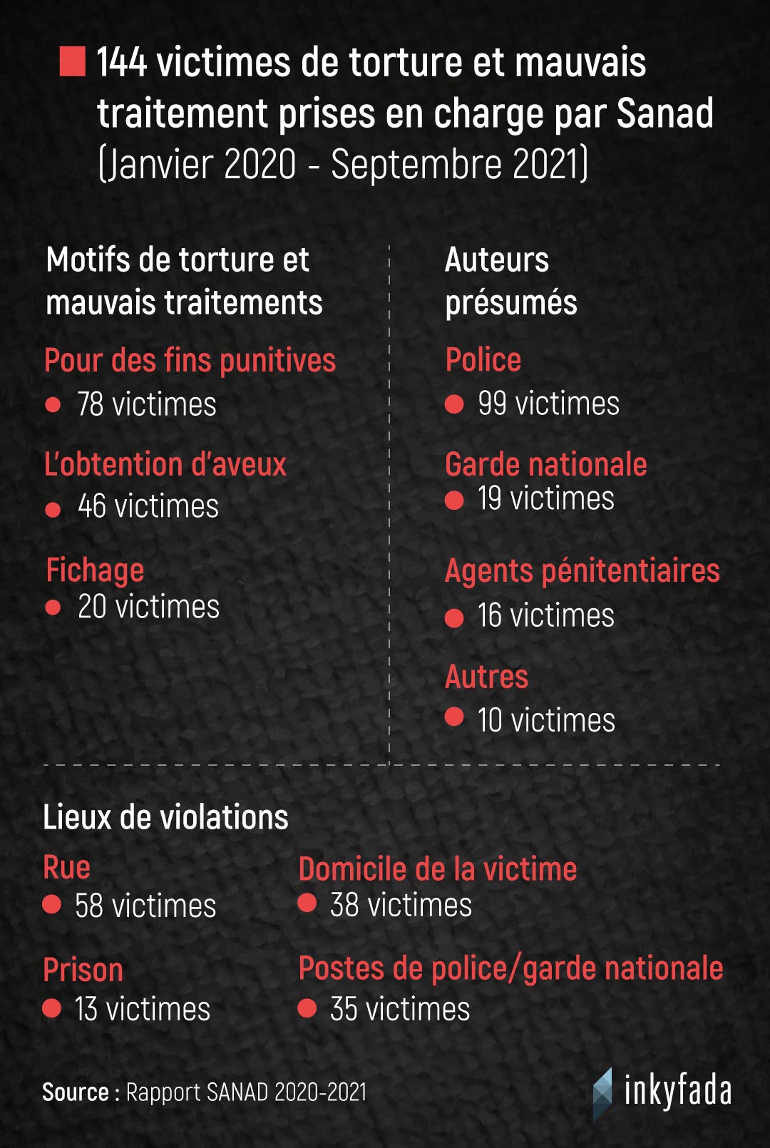 Plus récemment, un rapport, publié par l’OMCT, décompte 144 victimes de mauvais traitements, entre 2020 et 2021. Parmi elles, 99 ont été agressées par des agents de police, 19 par des agents de la Garde nationale et 16 par des agents pénitentiaires.