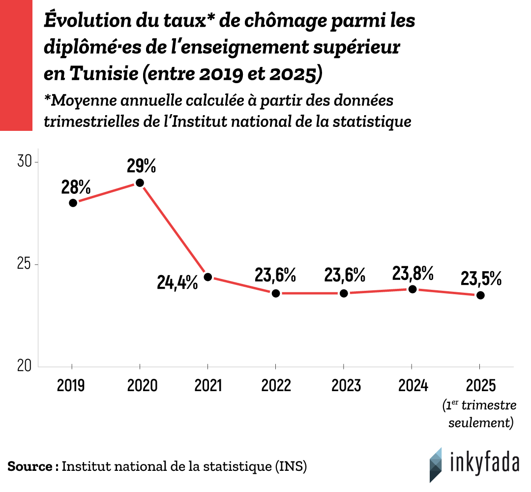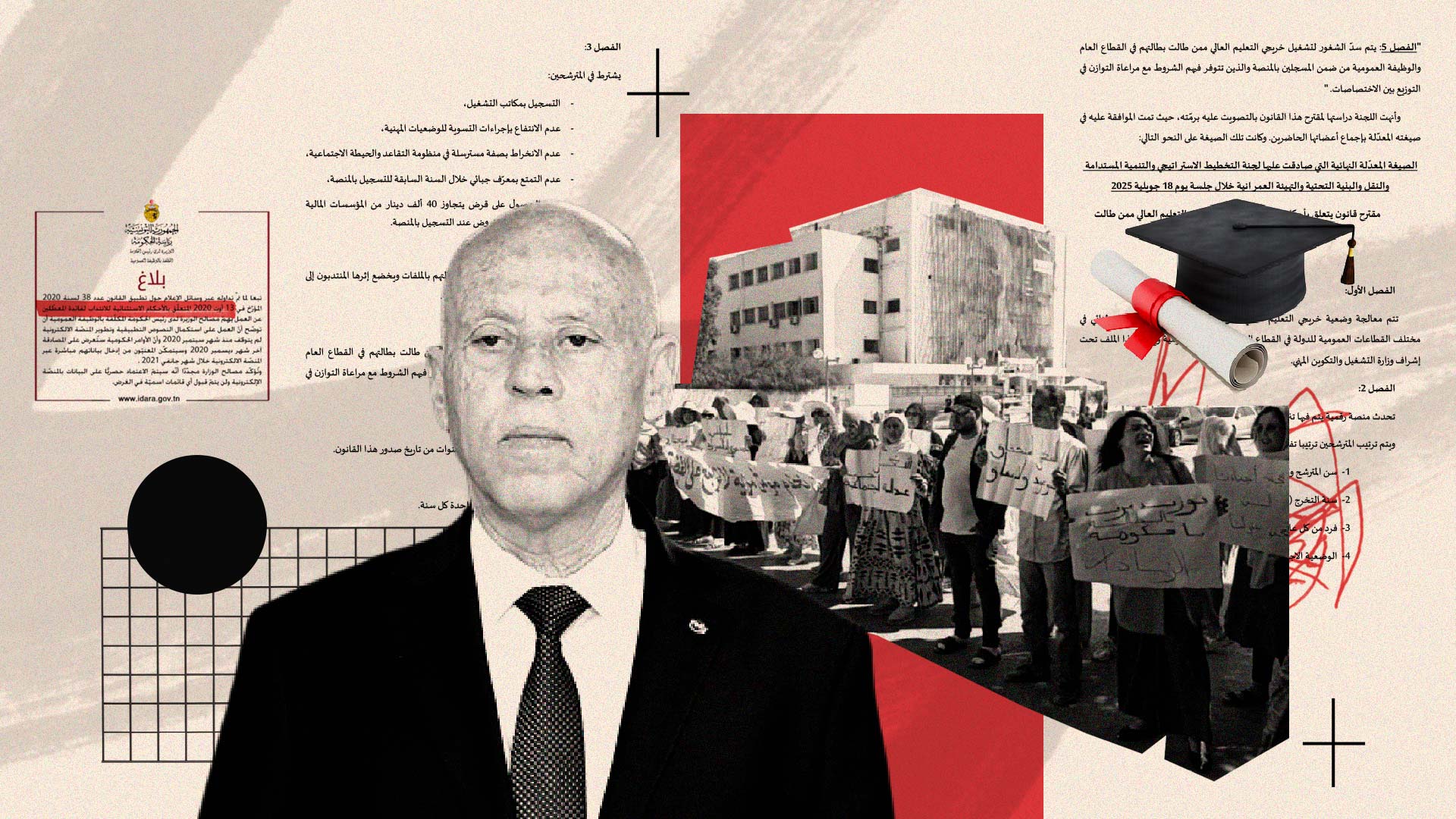 Cette mesure s’inscrit dans le cadre de la loi n° 38 de 2020, qui établit des dispositions exceptionnelles pour le recrutement dans le secteur public au profit de cette catégorie de chômeurs et chômeuses. Cette loi représentait alors une initiative législative réunissant plusieurs groupes parlementaires au sein du conseil dissous, parmi lesquels le Courant démocratique, le Mouvement du peuple et le Mouvement Ennahdha.