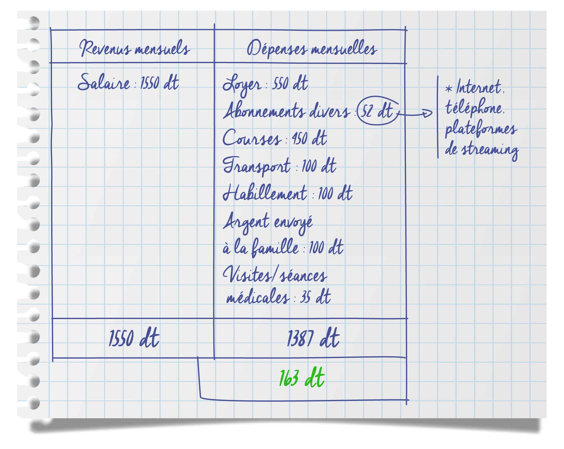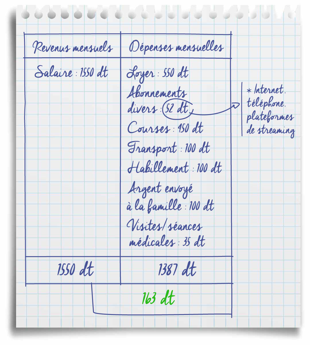 Récemment, grâce à l’augmentation de son salaire, le jeune homme a pu déménager de l’appartement en colocation qu’il louait depuis son arrivée à la capitale. Cet événement constitue sa plus grosse dépense : entre la caution, la location d’un véhicule, la facture a atteint 1350 dinars. Un somme considérable, mais Hazem a su rebondir. Celui-ci continue d’envoyer de l’argent à sa famille, malgré son budget serré, et s’efforce d’adapter son train de vie à ses revenus.