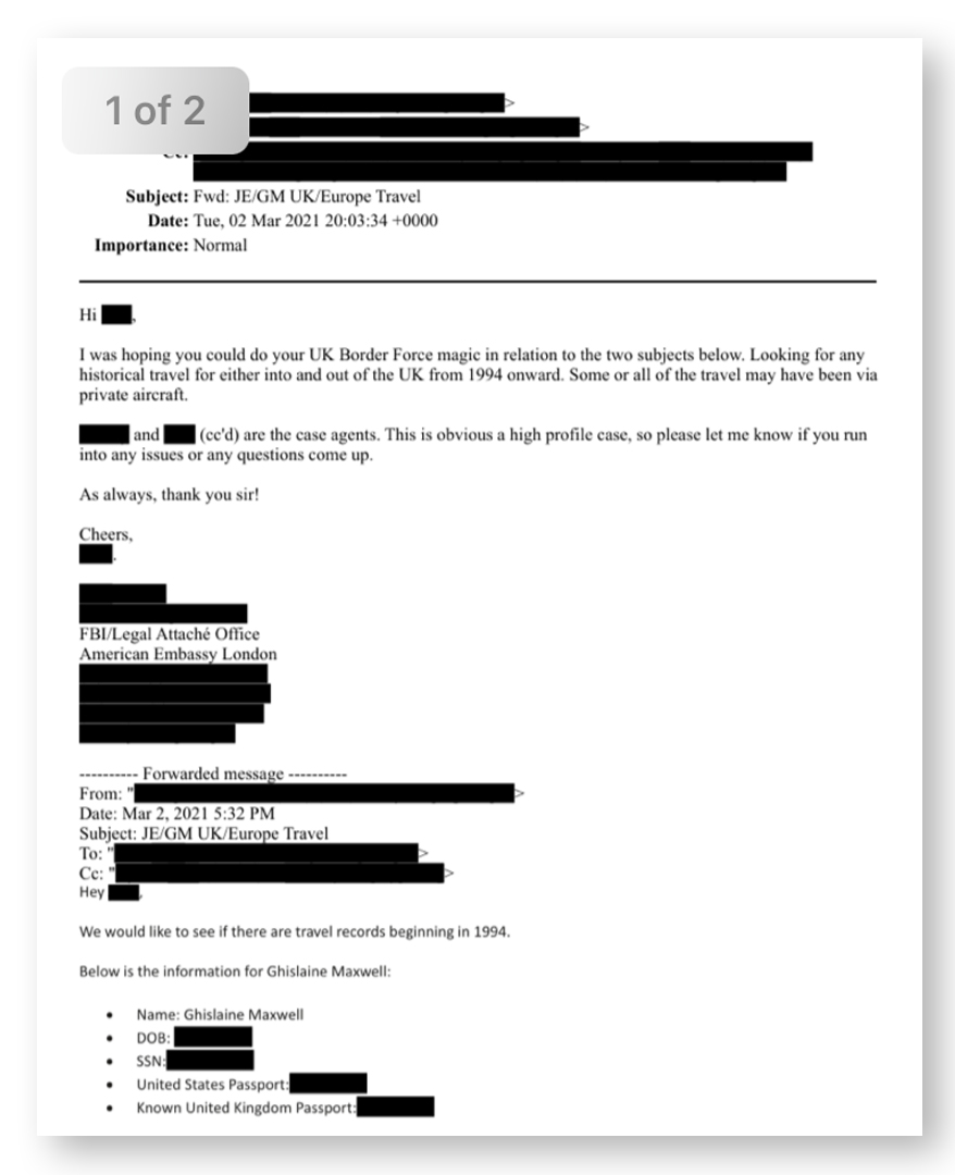 aux autorités britanniques les données frontalières concernant Jeffrey Epstein et Ghislaine Maxwell depuis 1994, dans le cadre de la reconstitution de leurs déplacements en Europe, y compris ceux effectués à bord d'avions privés.