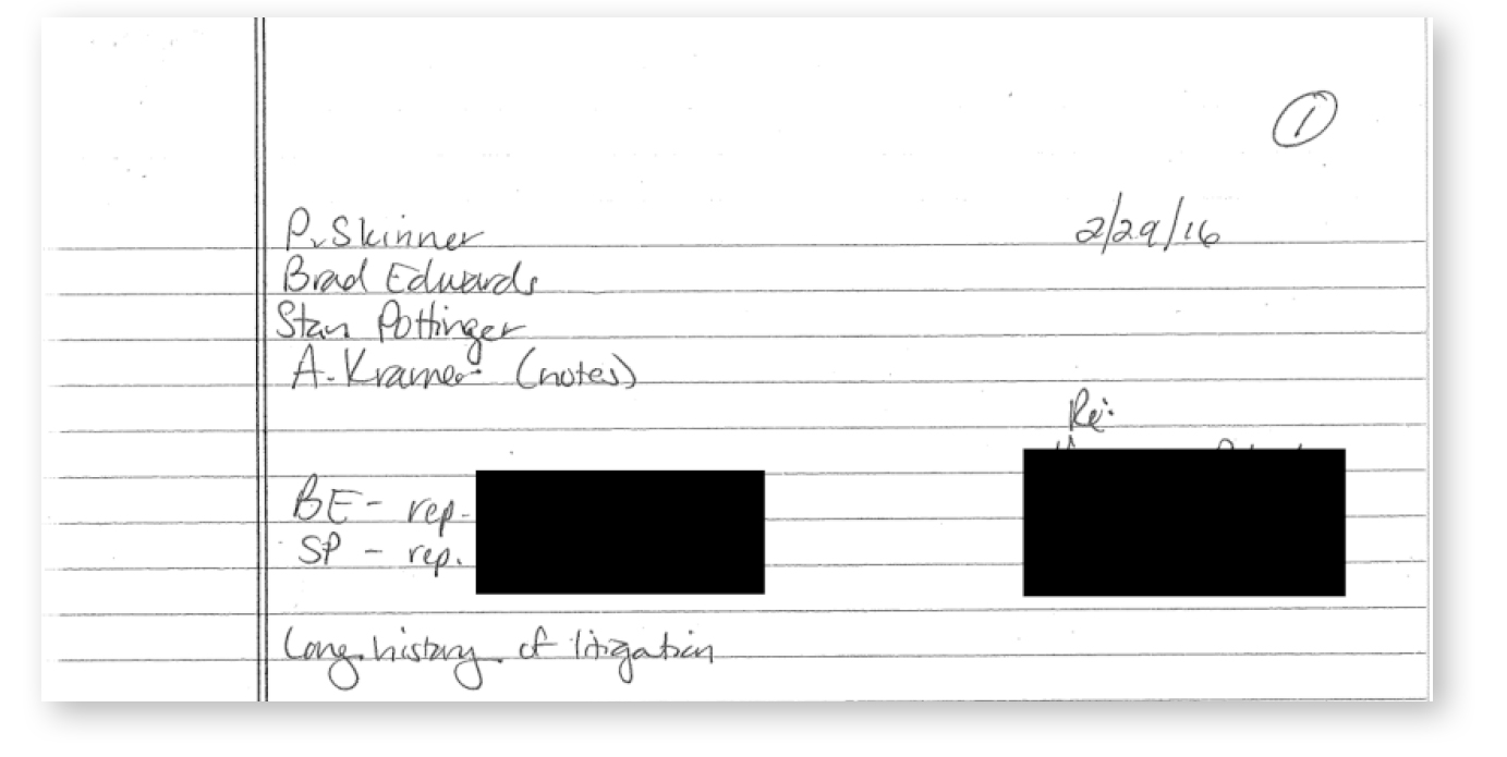 Notes manuscrites d'enquête datant de 2016, résumant des témoignages, des méthodes de recrutement et des évaluations internes du réseau Epstein, avec des références à des recruteurs de mode, des intermédiaires et des accusations de trafic organisé citées par la suite dans des dossiers judiciaires sous scellés.