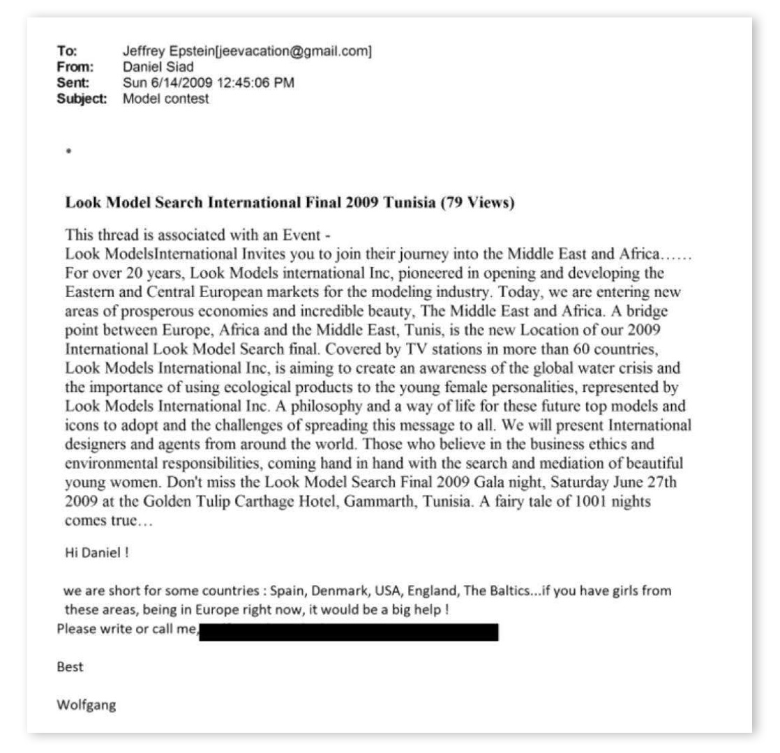 En 2009, Daniel Amar Siad transmet à Epstein des documents promotionnels relatifs à la finale internationale du Look Model Search, organisée à Tunis à l'hôtel Golden Tulip Carthage. Ces éléments incluent un courriel de Wolfgang Schwarz, directeur général de Look Models International, sollicitant de l'aide pour recruter des mannequins dans plusieurs pays.