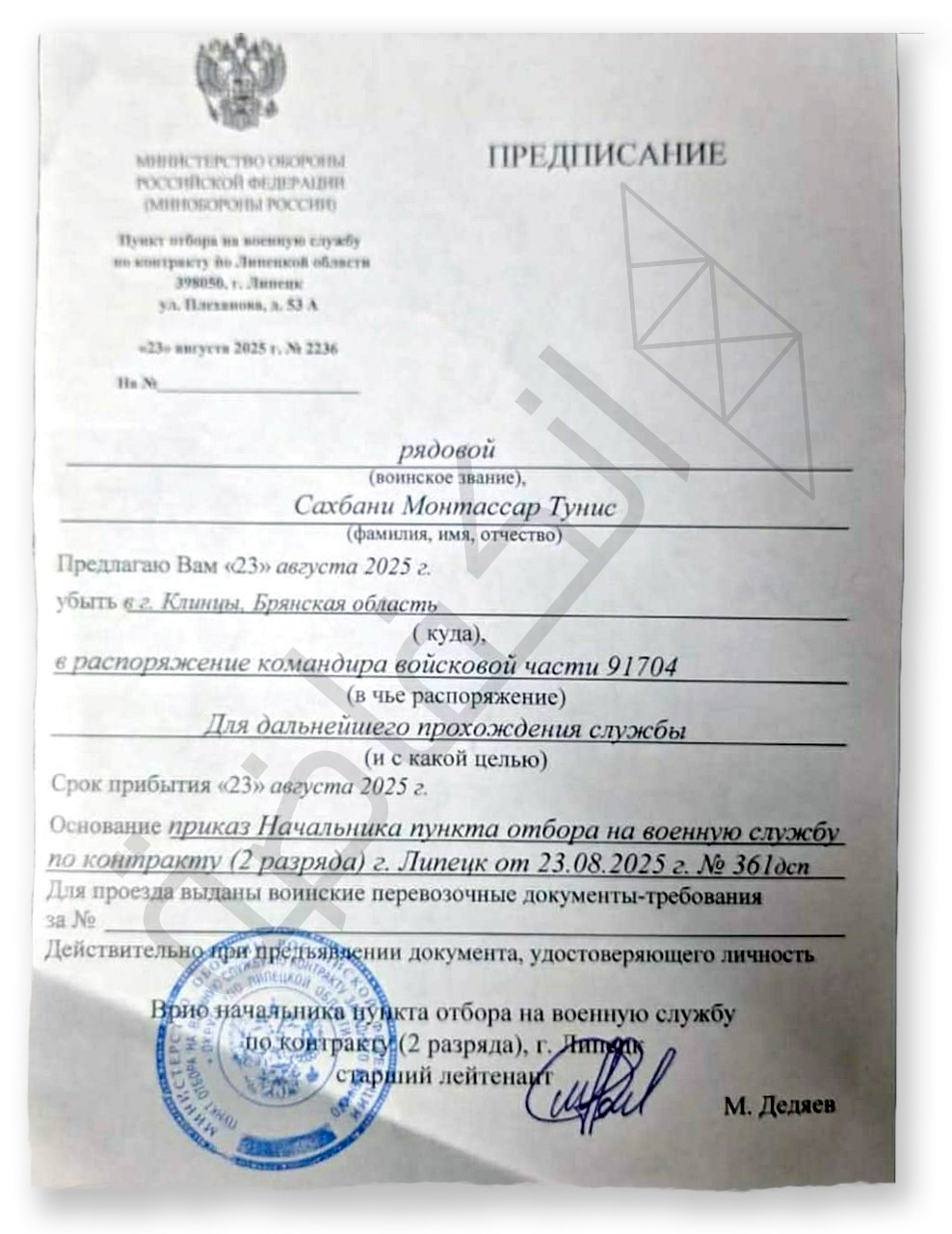 Peu après, Montassar transmet à sa famille un document militaire daté du 23 août 2025, émis par le point de sélection pour le service militaire sous contrat de la région de Lipetsk. Il y figure avec le grade de “ soldat” et reçoit l’ordre de se rendre le jour même à Klintsy, dans la région de Briansk, pour se placer “ à la disposition du commandant de l’unité militaire n° 91704, pour la poursuite du service”.