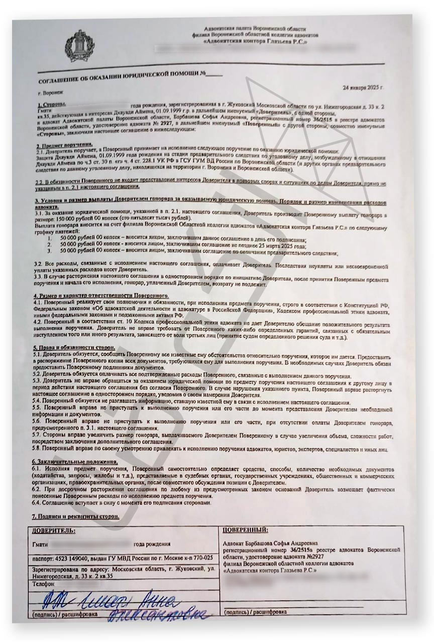 Contrat d’assistance juridique signé avec une avocate russe chargée d’assurer la défense d’Aymen Dhaouadi durant l’enquête préliminaire.