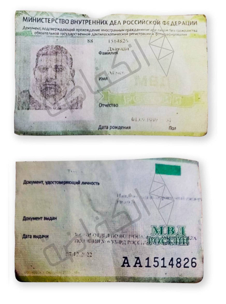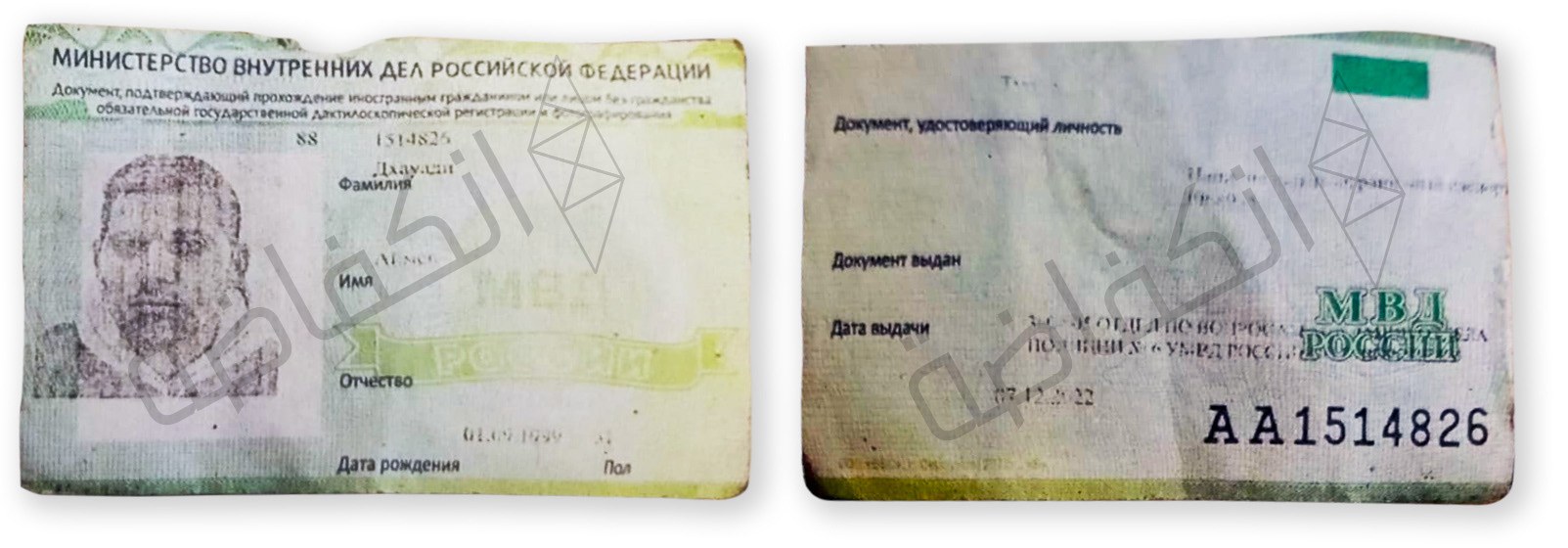 Carte d’enregistrement délivrée par le ministère russe de l’Intérieur au nom d’Aymen Dhaouadi. Ce document atteste de l’enregistrement administratif d’un ressortissant étranger sur le territoire russe.