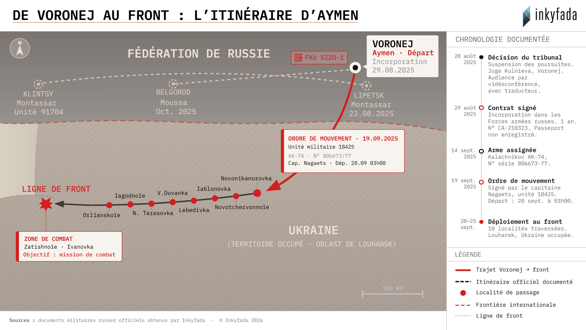 Le cas d'Aymen n'est pas isolé au sein même de son cercle immédiat. Son ami marocain Moussa, arrêté avec lui dans les mêmes circonstances et détenu au même centre de Voronej, a suivi une trajectoire identique, jusqu'à leur séparation au moment de l'affectation, en raison d'une irrégularité dans les documents administratifs de Moussa. C'est en remontant le fil de cette affaire parallèle, en collaboration avec notre partenaire Le Desk, média marocain d'investigation, que nous avons pu recouper et consolider les éléments recueillis sur Aymen.