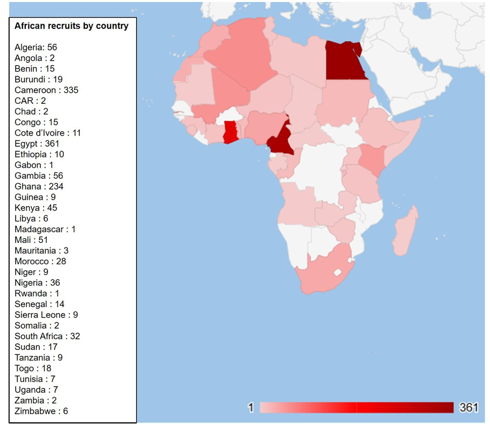 Carte issue du rapport de l’ONG INPACT (février 2026) montrant le nombre de ressortissants africains identifiés comme recrutés dans l’armée russe. Le fichier analysé par l’organisation recense 1 417 recrues originaires de plus de trente pays africains, dont sept Tunisiens.