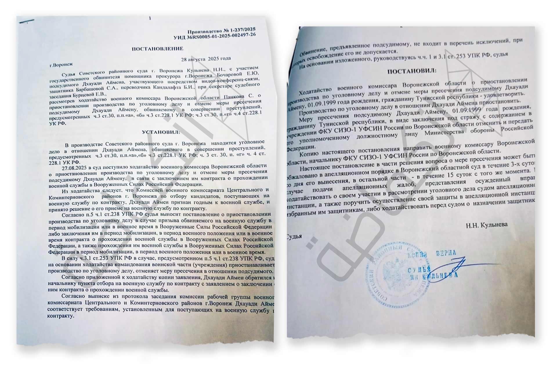 Ce “ ça”, selon les éléments judiciaires transmis à la famille, prend la forme d’un contrat de service militaire conclu pendant la période de mobilisation. Le 28 août 2025, le tribunal du district soviétique de Voronej rend une décision indiquant qu’” Aymen, citoyen tunisien, a conclu un contrat pour effectuer son service dans les Forces armées de la Fédération de Russie”. Sur cette base, et conformément aux articles 238 alinéa 1 point 5 et 253 alinéa 3.1 du Code de procédure pénale russe, le juge suspend la procédure pénale et annule la mesure de détention provisoire.