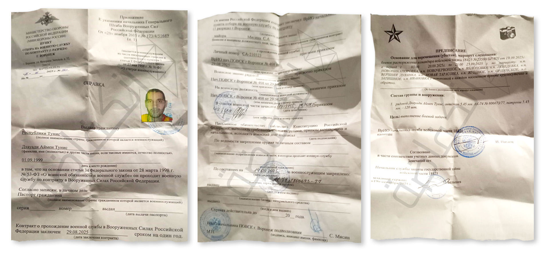 Documents militaires russes relatifs à l’enrôlement d’Aymen Dhaouadi dans les forces armées russes. Ils indiquent la signature d’un contrat de service militaire le 29 août 2025 à Voronej et mentionnent son intégration dans une unité engagée dans des opérations militaires.