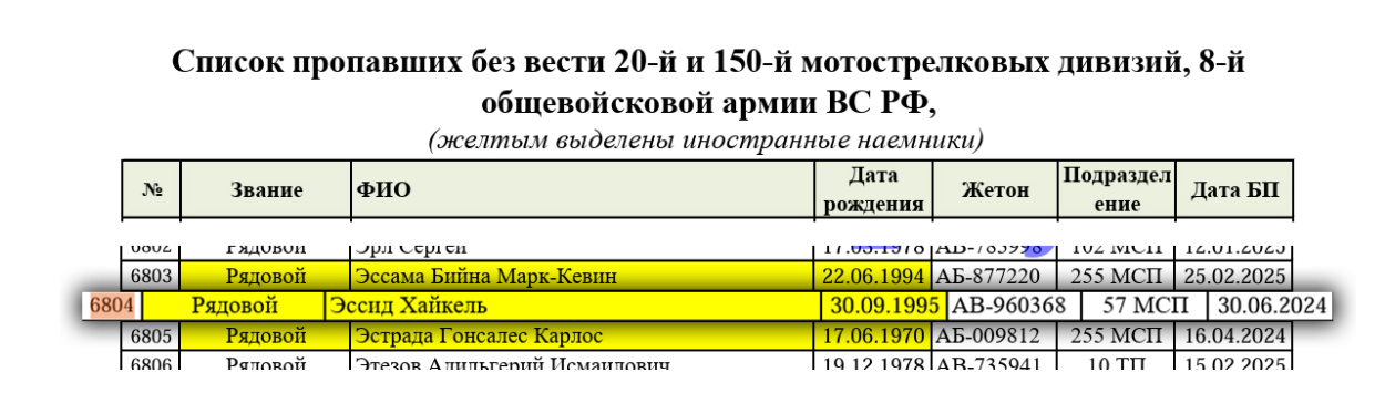 Ce dernier est identifié comme Haykel Essid, né le 30 septembre 1995. Deux de ses amis, qui ont cherché à le localiser après sa disparition, ont reconstitué son parcours à partir des éléments qu'ils ont pu réunir. C'est au cours de leurs recherches qu'ils ont découvert, sur un canal Telegram, un document présenté comme la liste des disparus des 20e et 150e divisions de fusiliers motorisés de la 8e armée interarmes des forces armées de la Fédération de Russie. À la ligne 6804 figure la translittération russe du nom de Haykel Essid, avec la date de naissance du 30 septembre 1995.
