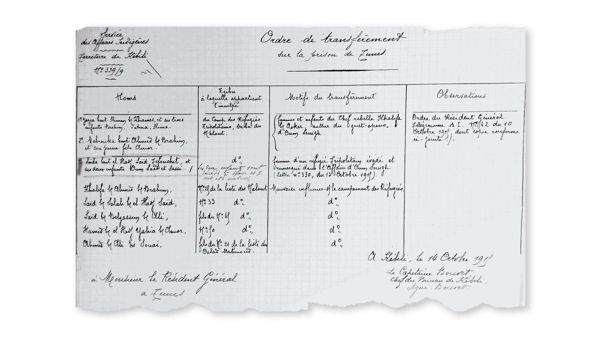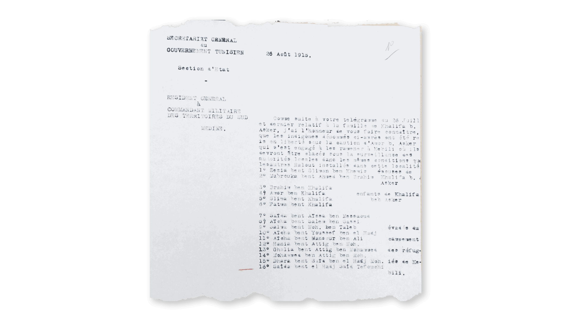 On y découvre que les deux épouses de Khalifa Ben Asker et leurs enfants sont transféré⋅es car celui-ci est “l’auteur du guet-apens d’Oum Souigh”. En plus d’une liste d’hommes transférés en raison de “leur mauvaise influence sur le campement des réfugiés”, se trouvent les noms de Saïda bent el Hadj Saïd Tefouchit et de ses deux enfants, Oum Saâd et Sassi.