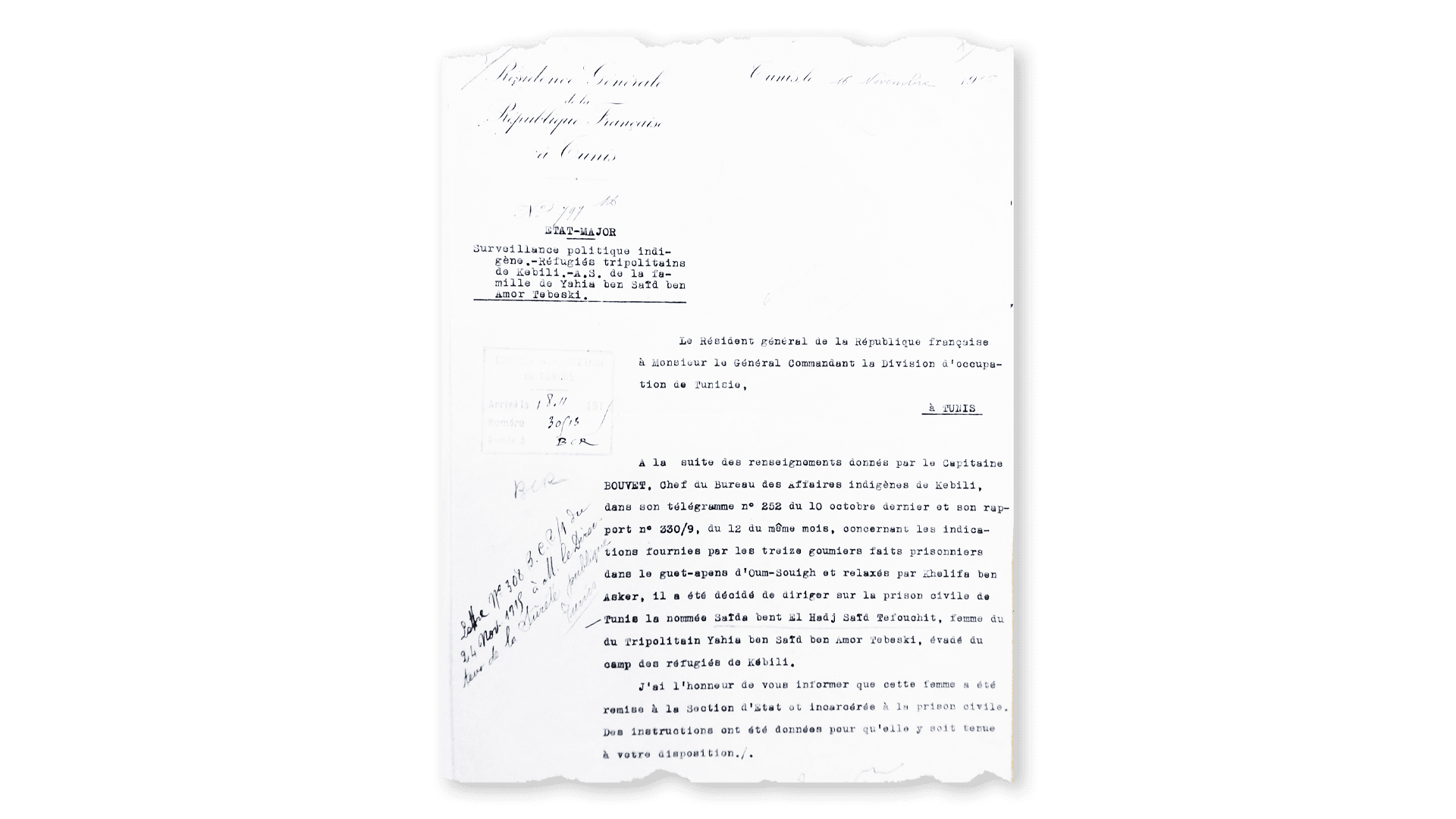 “Il a été décidé de diriger sur la prison de Tunis la nommée Saïda bent El Hadj Saïd Tefouchit, femme du Tripolitain [...] évadé du camp de réfugiés de Kébili.”
