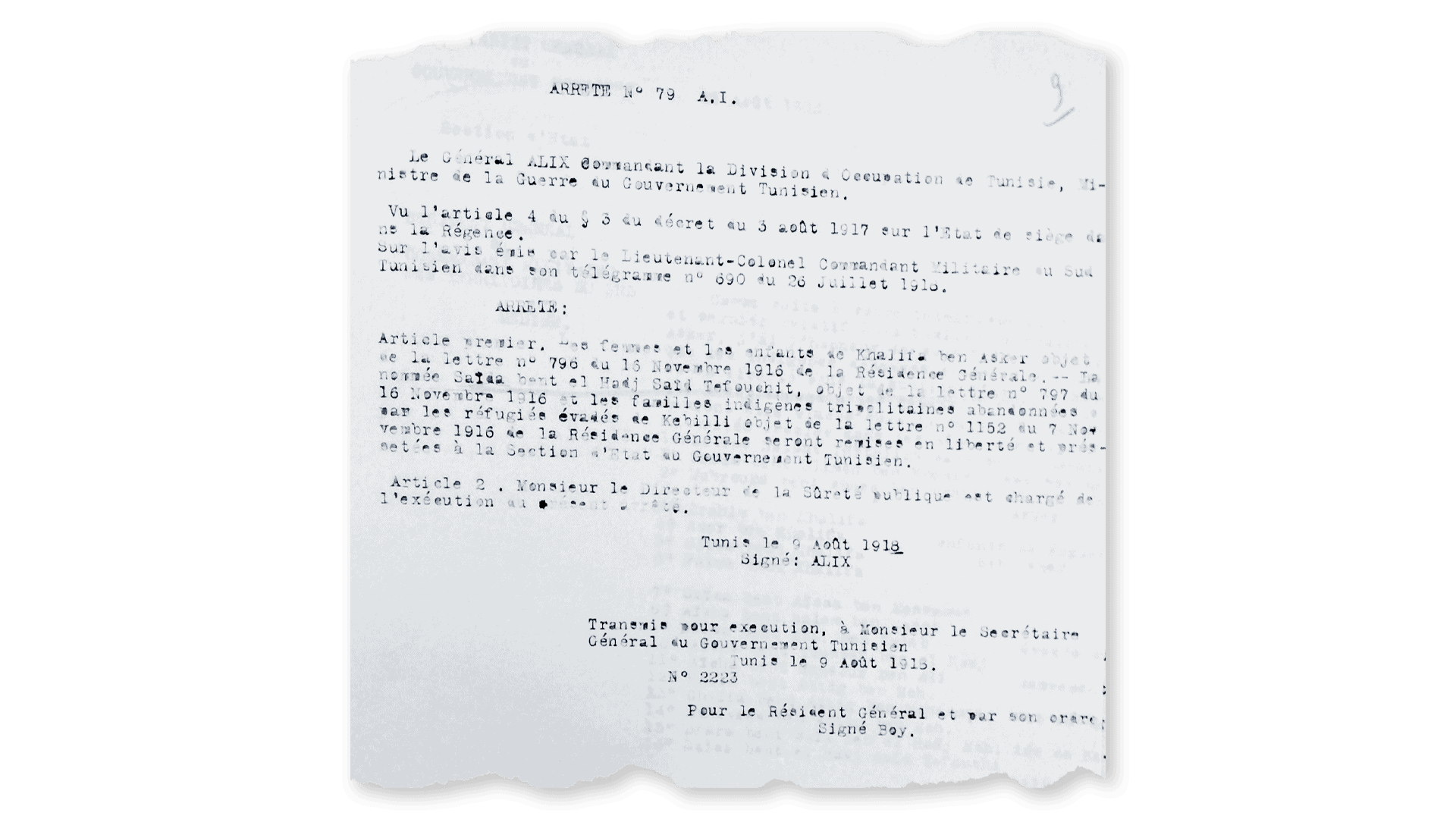 Saïda Tefouchit arrive ainsi seule, sans ses enfants, à Tunis pour être “remise à la section d’État et incarcérée à la prison civile” comme le précise un courrier envoyé le 16 novembre 1915 par le Résident général au Général commandant la Division d’occupation. C’est d’ailleurs l’institution militaire qui est censée gérer son cas comme le montre une note du 20 novembre : “elle devra être tenue à la disposition de M. le Général commandant la division d’occupation”.